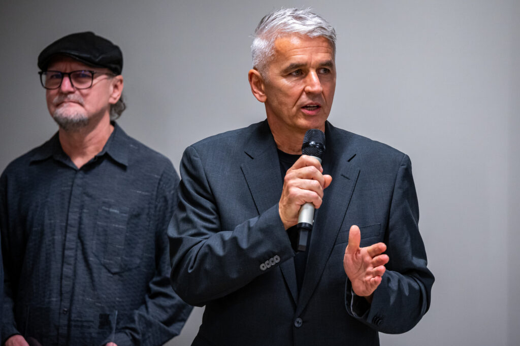 Krzystof Duczki tolmácsolásával nyitotta meg a kiállítást dr. Mateusz Machalski, a Varsói Képzőművészeti Akadémia rektorhelyettese és grafikusművésze (jobbra).