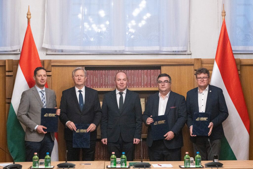A megállapodás új lehetőségeket nyit a Gundel-iskola diákjai számára. A felvételen dr. Kovács Zsolt, a Széchenyi István Egyetem általános és oktatási elnökhelyettese, dr. Friedler Ferenc professzor, az egyetem rektora, tudományos elnökhelyettese, Pálmai Gergely szakképzésért felelős helyettes államtitkár, Elek Csaba, a Budapesti Komplex Szakképzési Centrum főigazgatója és Kóbor Zoltán, a BKSZC Gundel Károly Vendéglátó és Turisztikai Technikum igazgatója.