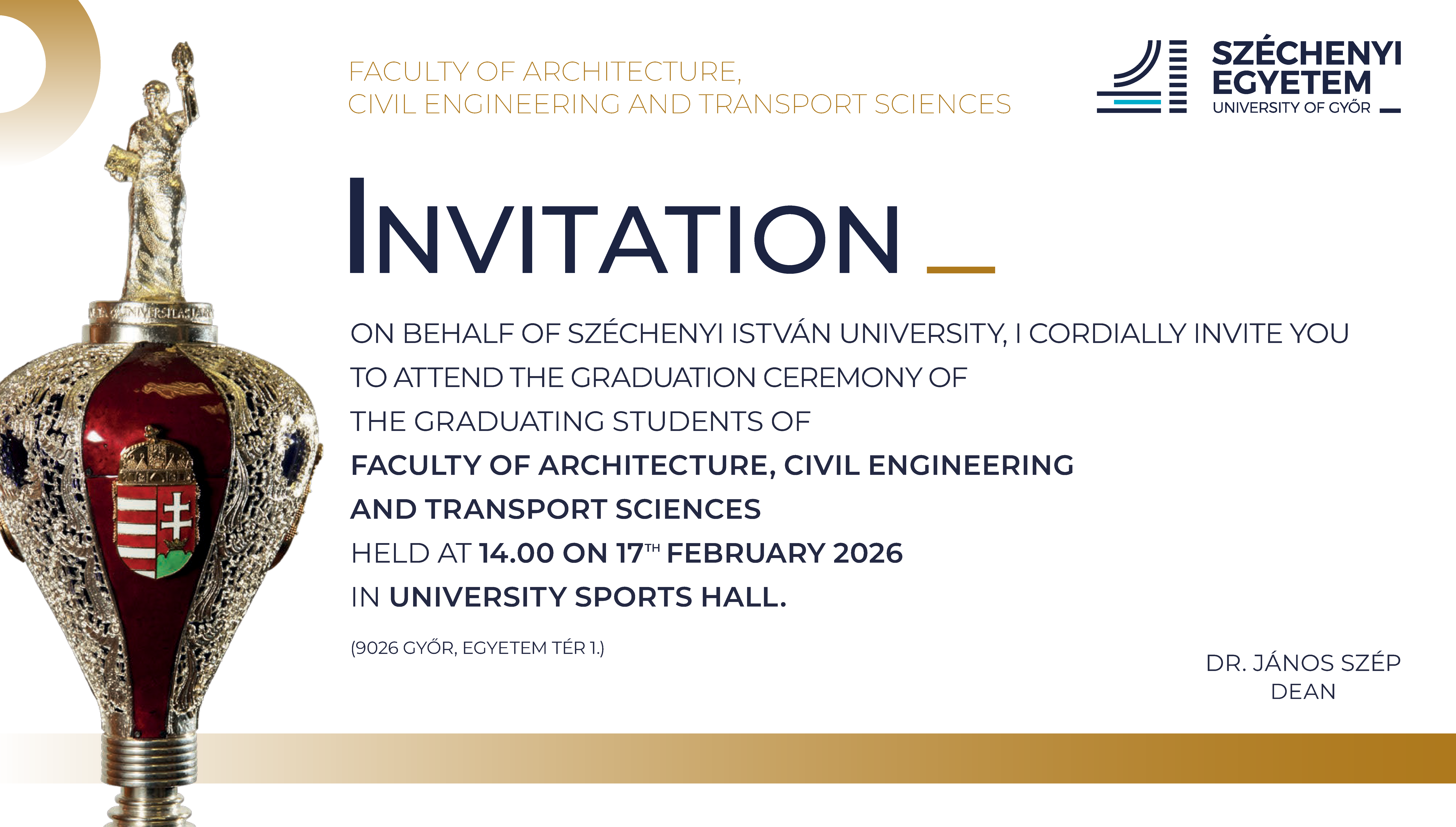 Faculty of Architecture Civil Engineering and Transport Sciences 17 February, 2026 Tuesday 14:00 9026 Győr, Egyetem tér 1. University Sports Hall Download Download