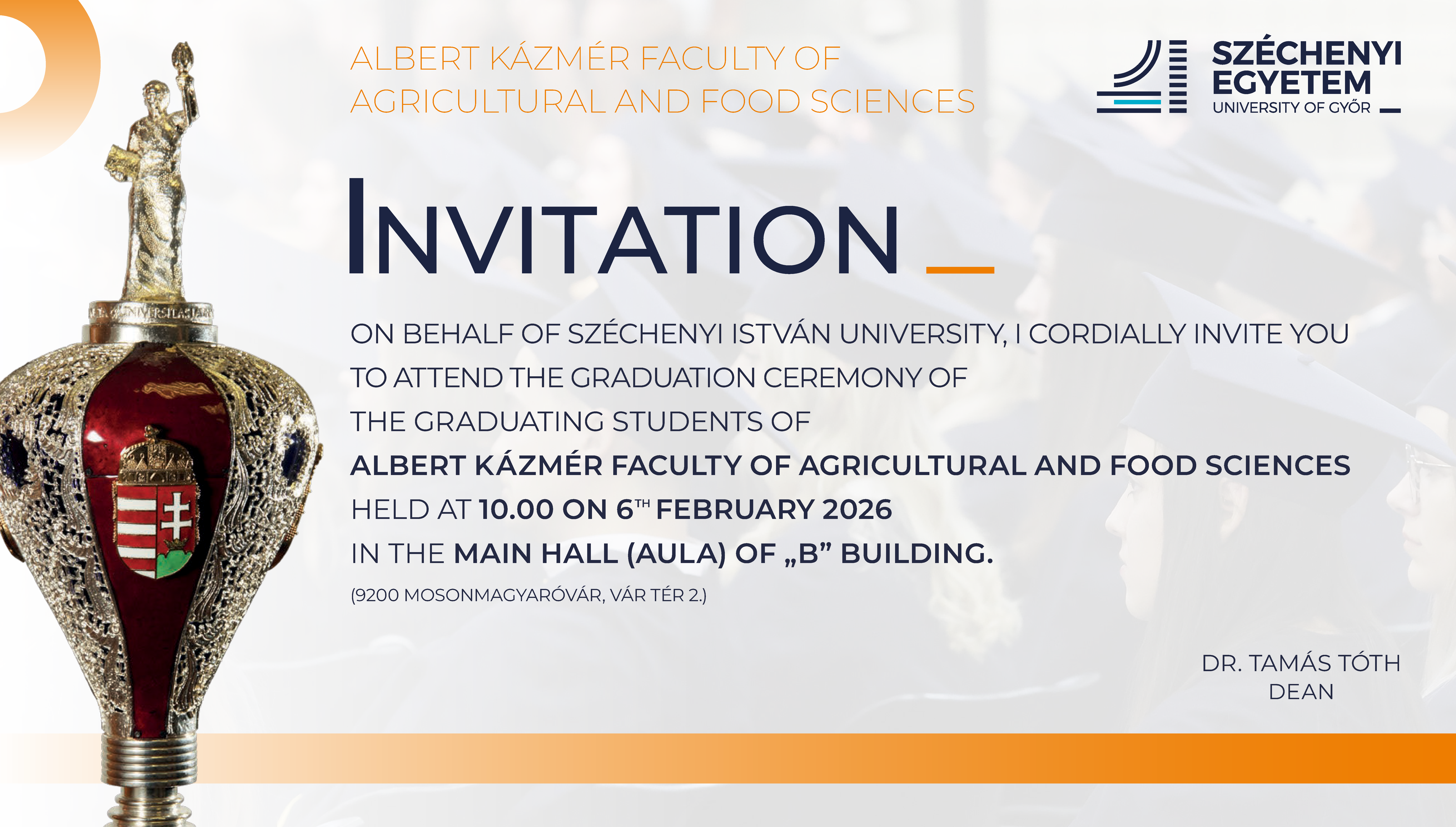 Albert Kázmér Faculty of Agricultural and Food Sciences 6 February, 2026 Friday 10:00 9200 Mosonmagyaróvár, Vár tér 2. B Building AULA Download Download