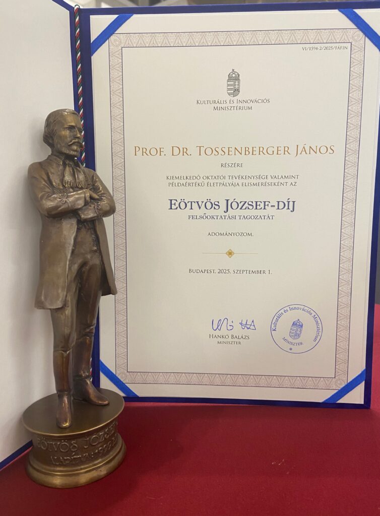 Dr János Tossenberger, Advisor to the Dean and Professor of the Department of Animal Sciences at Széchenyi István University’s Albert Kázmér Faculty of Agricultural and Food Sciences, has been awarded the József Eötvös Prize in recognition of his professional career and his several decades of pioneering work in agricultural higher education. The award is presented by the Ministry of Culture and Innovation to individuals who, through their outstanding teaching and educational activities and their commitment to the teaching profession as a lifelong vocation, have made a lasting contribution to Hungarian education.