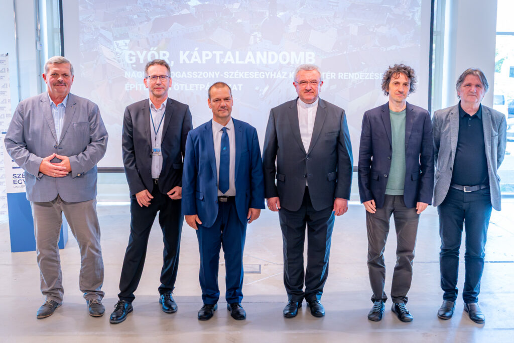 A pályázat széles körű együttműködésben valósul meg. A felvételen Andorka Miklós egyházmegyei főépítész, Szaksz Vince városi főépítész, dr. Szép János, a Széchenyi István Egyetem Építész-, Építő- és Közlekedésmérnöki Karának dékánja, dr. Veres András győri megyéspüspök, Szentirmai Tamás, az Épülettervezési Tanszék vezetője és U. Nagy Gábor, az Építőművész Tanszék vezetője.