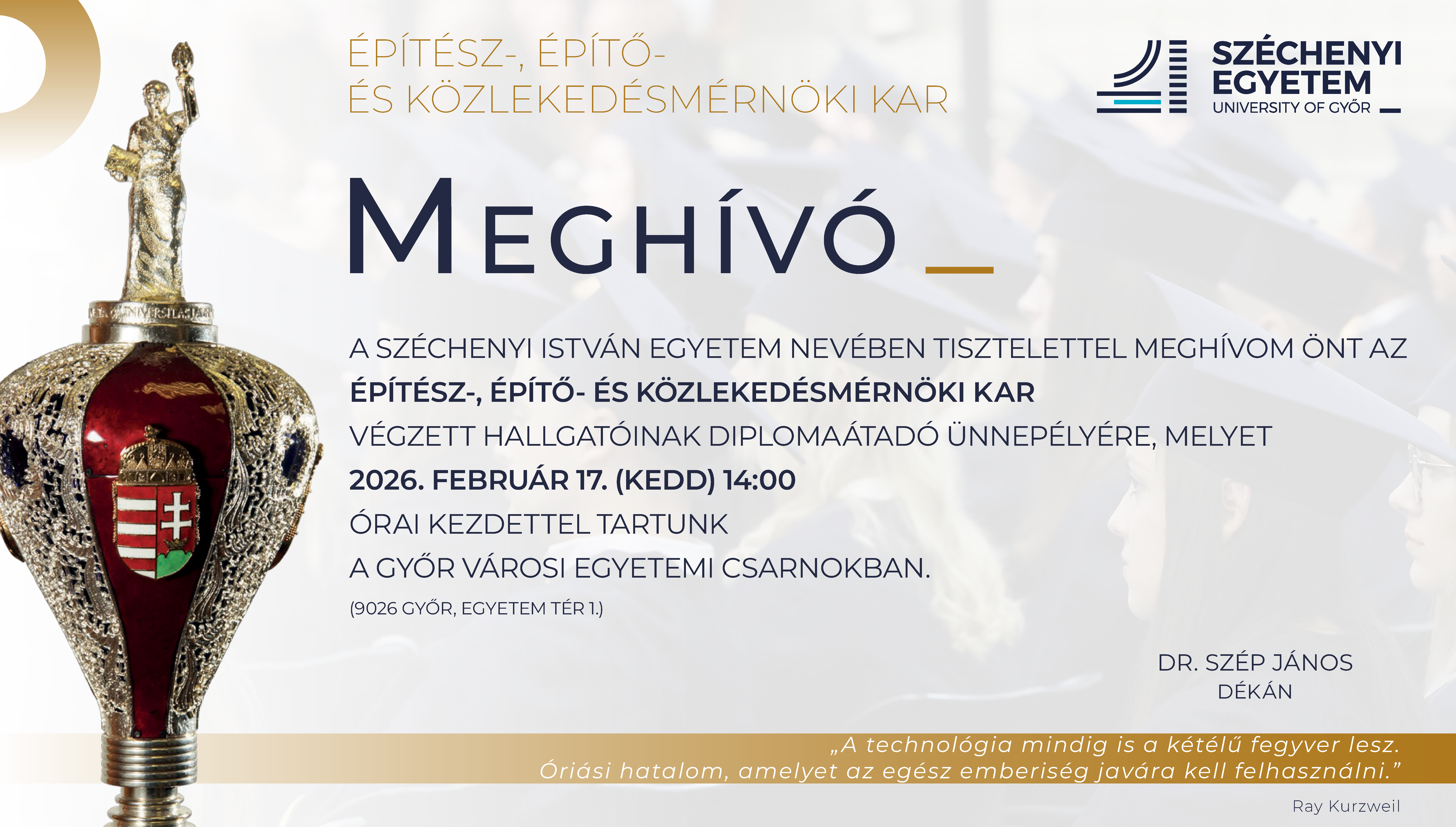 | Építész-, Építő- és Közlekedésmérnöki Kar Diplomaátadó Ünnepély | 2026. február 17. kedd | 14:00 | 9026 Győr, Egyetem tér 1. | Győr Városi Egyetemi Csarnok | Letöltés | Letöltés |