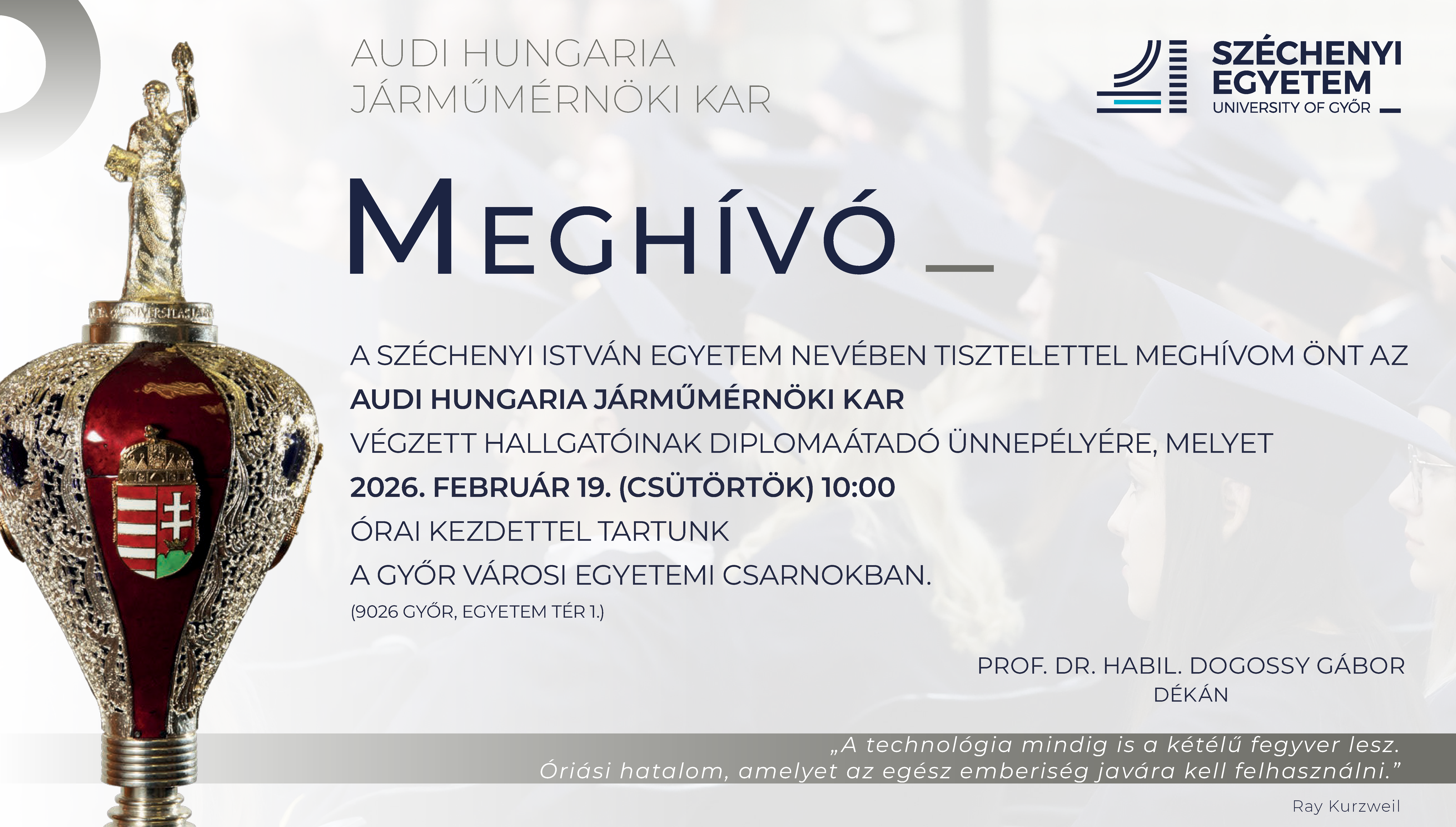 | Audi Hungaria Járműmérnöki Kar Diplomaátadó Ünnepély | 2026. február 19. csütörtök | 10:00 | 9026 Győr, Egyetem tér 1. | Győr Városi Egyetemi Csarnok | Letöltés | Letöltés |