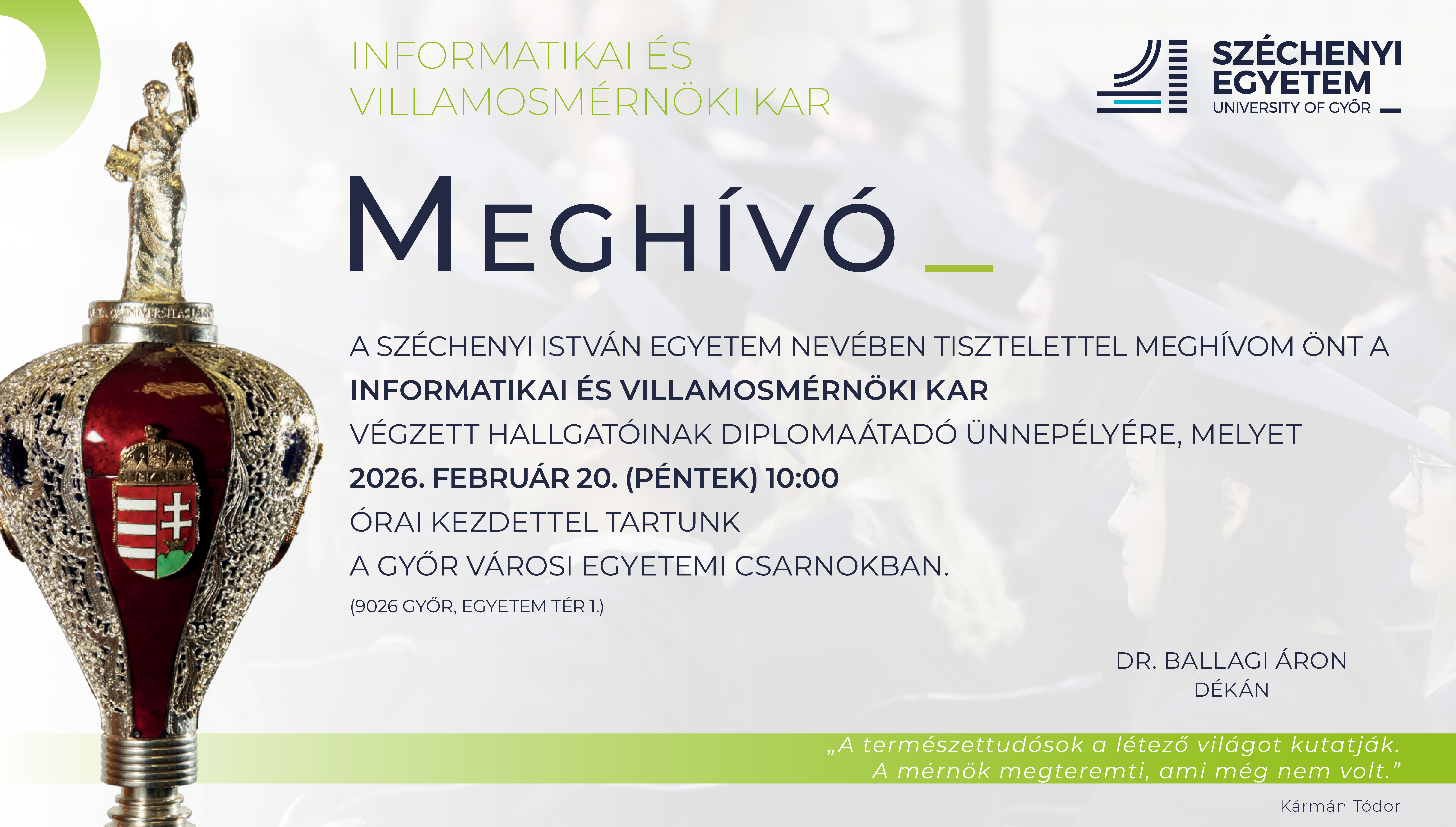 | Informatikai és Villamosmérnöki Kar Diplomaátadó Ünnepély | 2026. február 20. péntek | 10:00 | 9026 Győr, Egyetem tér 1. | Győr Városi Egyetemi Csarnok | Letöltés | Letöltés |