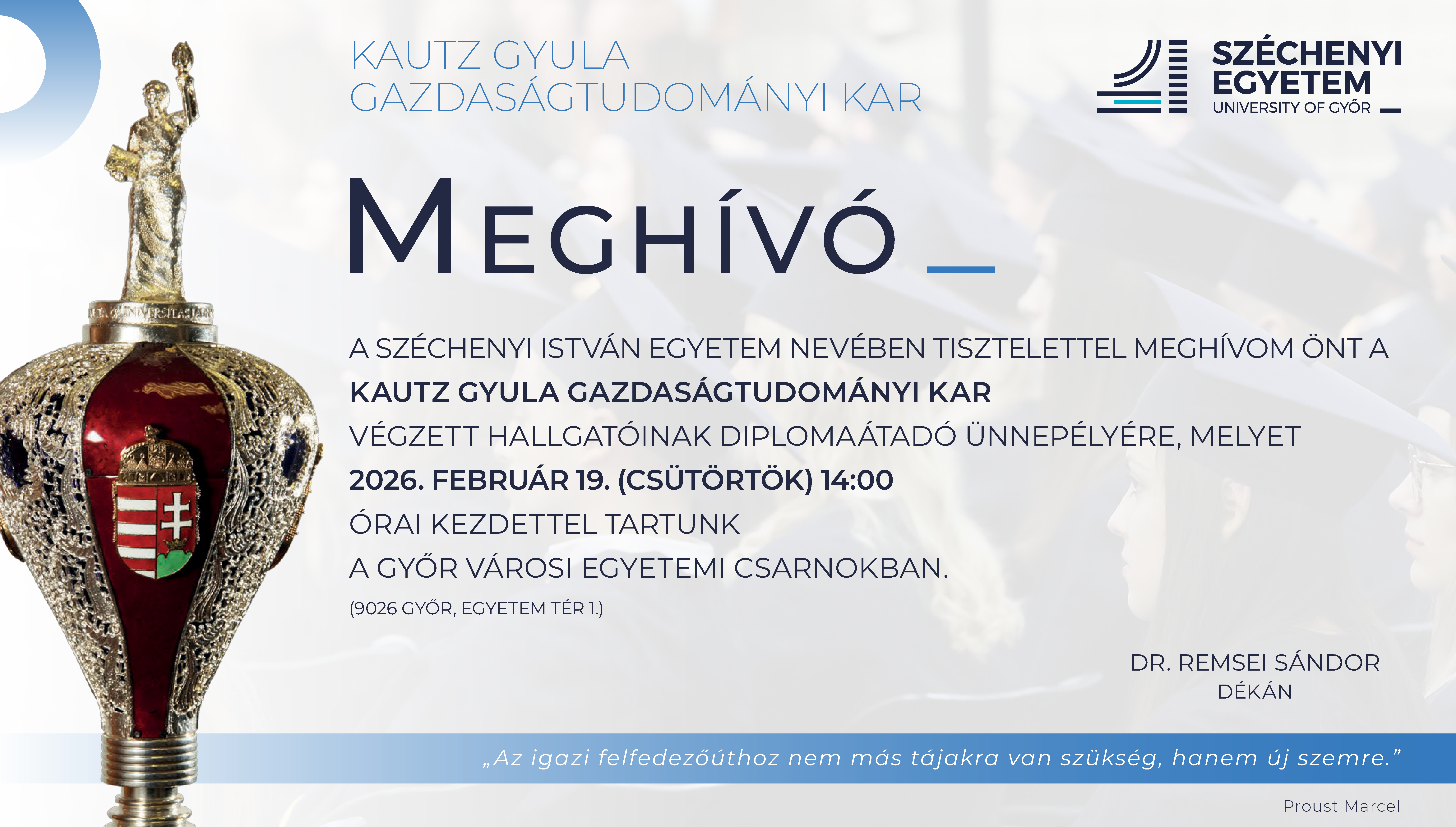 | Kautz Gyula Gazdaságtudományi Kar Diplomaátadó Ünnepély | 2026. február 19. csütörtök | 14:00 | 9026 Győr, Egyetem tér 1. | Győr Városi Egyetemi Csarnok | Letöltés | Letöltés |