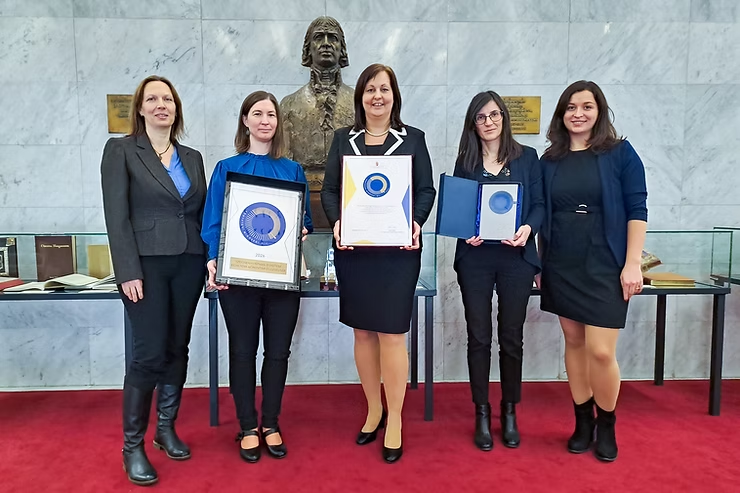 A Könyvtári Minőségi Díjat az Országos Széchényi Könyvtárban adták át. A felvételen Kékesi Ilona könyvtáros, Tóthné Marek Eszter központvezető, Tóth Csilla igazgató, Tóth Henrietta osztályvezető és Makkai Csilla könyvtáros kollégák láthatóak.